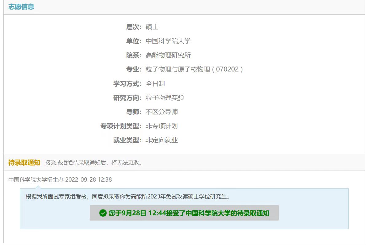 推免路上,我先后参加了华中科技大学,南开大学,电子科技大学,吉林大学等多所985高校和科研院所的夏令营,学习了物理的很多科普知识,了解了物理的不同方向,并获得优秀营员。参加中科院高能物理所夏令营的时候,我看到了北京正负电子对撞机,北京谱仪,江门中微子实验等大科学装置,了解了物理学前沿领域,使我下定决心学习粒子物理与原子核物理专业,投身于科研。最终我选择了中科院高能物理研究所,进行下一阶段的学习研究。