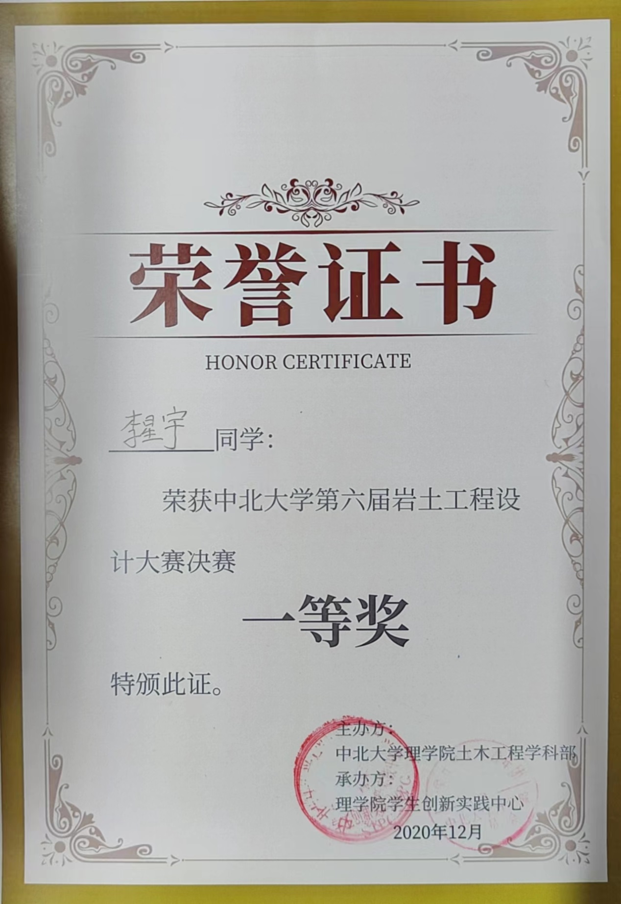 2019-2020学年获得获校级综合素质三等奖学金,2020-2022两学年获得校级综合素质二等奖学金,GPA 3.25,目前专业排名19/95,现已考至大连理工大学等离子体物理学专业。