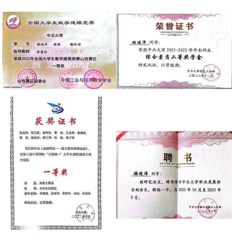 优秀共青团员、勤工助学优秀个人、志愿服务证书、第八届“互联网+”一等奖、大学生数学建模竞赛山西省一等奖、多次获得5G影院
