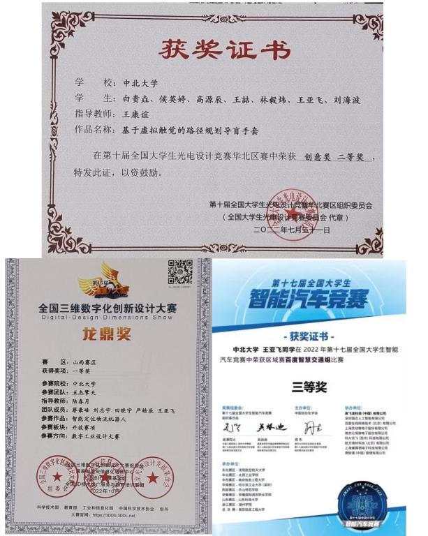 学有余力的同时,我也积极参加各类竞赛,在一次机缘巧合下参与了智能机器人实验班的选拔,在选拔中认真学习python,51/32单片机的相关技能,最终以较为优异的成绩通过选拔,之后分流进入车型工作室,在这里结识了一些志同道合的朋友,也为之后参加各类竞赛时寻找队友提供了方便。然而恰逢疫情肆虐,很多比赛都暂停举办,参赛之路困难重重,但功夫不负有心人,在我们的坚持下,最终获得了较为满意的竞赛成果:
