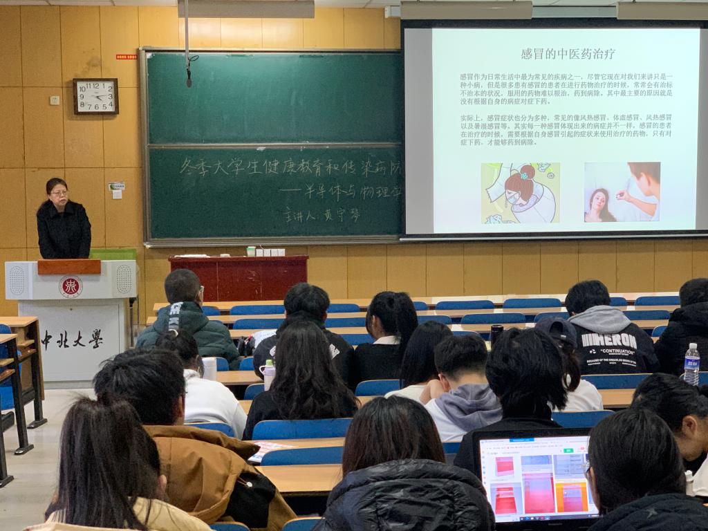 黄守琴主任结合当前呼吸道传播疾病的流行趋势和校医院目前临床工作实际,为同学们做了一场通俗易懂的中医学健康教育讲座。黄主任从中医学的角度为同学们介绍了流行性感冒的基本概念、致病因素、分型诊治以及治疗各类症型感冒的中成药的临床应用。黄主任告诉同学们,祖国的传统中医学、博大精深,是中华民族在长期的医疗和生活实践中,不断积累而成的具有独特理论风格的医学体系,在辨证施治、扶正祛邪等方面发挥了独特作用,应当不断传承和发扬光大。黄主任从中医学的角度为同学们提出了健康养生、防治疾病、抵御风寒、增强免疫的建议。希望同学们加强学习,掌握更多的防病治病知识,做一个既具有渊博知识、又有强壮体魄的新时代栋梁之才。
