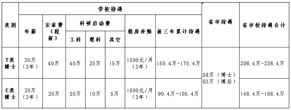 教学科研岗位招聘博士采用综合评价的方式,依据学历背景、学术水平、学院评价划分为T类、E类。学校为两类博士提供待遇如下: