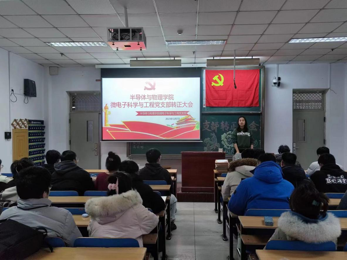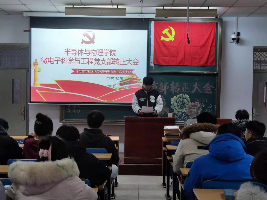 微电子科学与工程党支部于11106H召开预备党员转正支部大会。大会由党支部张沛甲同志主持。支部书记荆伟伟老师、王旭老师、支部全体正式党员、预备党员出席会议。
